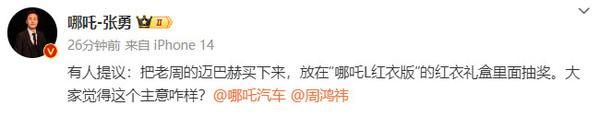 昨晚,哪吒l正式发布,购车可享不少权益,包括将赠送一个红衣特别礼盒。4月23日,哪吒汽车首席执行官ceo张勇发微博称:有人提议:把老周的迈巴赫买下来,放在“哪吒l红衣版”的红衣礼盒里面抽奖。大家觉得这个主意咋样?对此,网友表示:玩这么大?